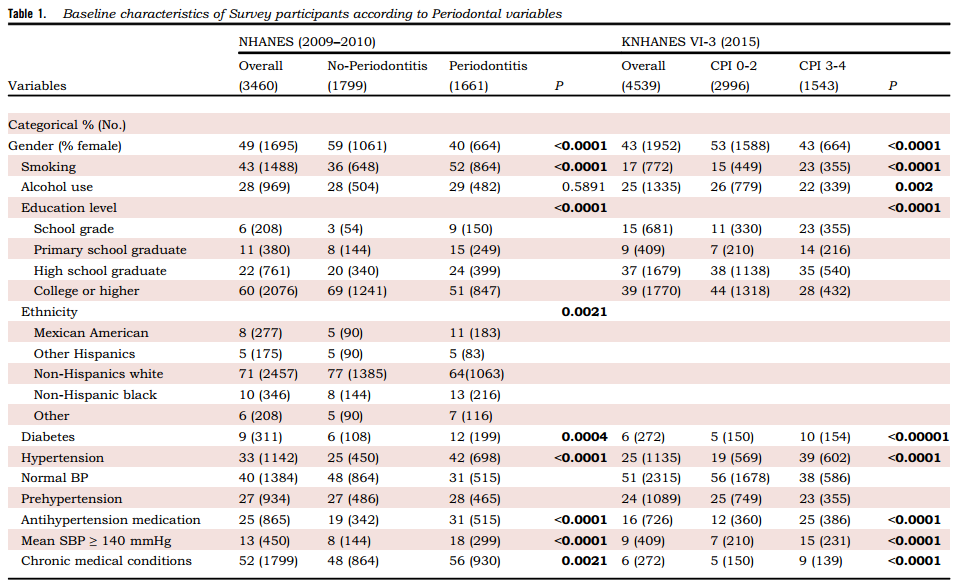 患有牙周炎的参与者主要是男性(NHANES, 60%;NHANES, 57%), 50岁以上,当前吸烟者人数增加(NHANES, 52%对36%;受教育程度较低和糖尿病患病率较高(NHANES, 12%对6%;NHANES, 10% vs 5%)比无牙周炎的参与者(表1)。高血压患病率几乎翻了一番(NHANES, 42% vs 25%;KNHANES, 39%对19%)和抗高血压药物(NHANES, 31%对19%;KNHANES (25% vs 12%)在牙周炎患者中观察到。同样,与没有牙周炎的调查参与者相比,患有牙周炎的参与者有更高的收缩压值(NHANES高6.4 mmHg, KNHANES高7.3 mmHg)。在NHANES的调查中,墨西哥和非西班牙裔黑人牙周炎的患病率最高。最后,当评估其他传统的心血管危险因素时,与没有牙周炎的患者相比,两项调查中牙周炎患者的葡萄糖、甘油三酯、hs-CRP和WBC值都更高,只有在KNHANES中牙周炎患者的BMI更高(P < 0.001)。
