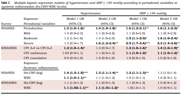 多元logistic回归模型证实,在患有牙周炎和牙周状况较差的参与者中,NHANES人群中高血压的调整几率分别为1.3 (95%CI 1.0 - 1.6)和1.2 (95%CI 1.0 - 1.4)(表2)。