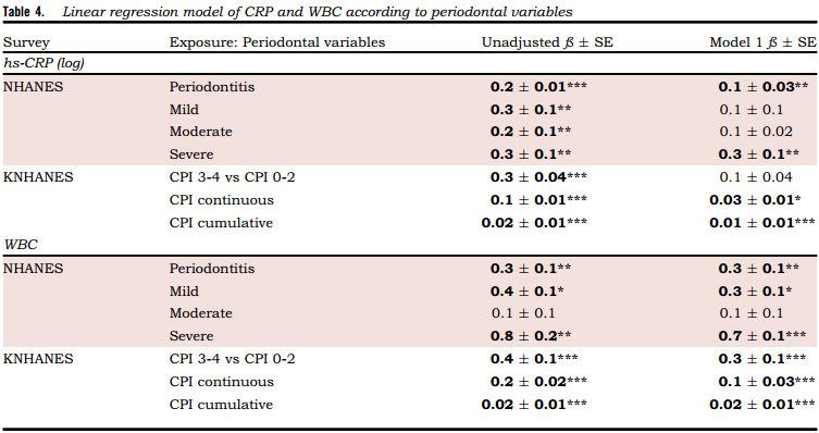 与没有牙周炎或牙周状况较好(CPI 0-2)的患者相比,美国和韩国患有严重牙周炎或牙周状况较差(CPI 3-4)的患者通过hs-CRP血清水平和白细胞计数显示出更大的全身炎症,这种差异与其他常见混杂因素无关(表4)。