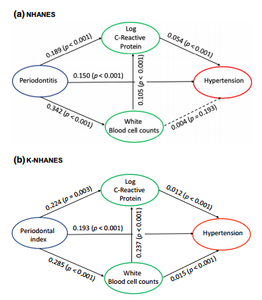 这些关联独立于年龄、性别、BMI、教育水平、吸烟、饮酒、肌酐、体力活动、其他合并症的存在,并在未服用抗高血压药物的参与者中得到证实。牙周炎的诊断与白细胞直接相关(两项调查中:NHANES:β±SE=0.3±0.1, P<0.004;KNHANES:β±SE=0.3±0.1, P<0.001)和CRP水平(在一次调查中:NHANES: β±SE=0.1±0.03, P < 0.007;KNHANES:β±SE=0.1 0.04,P > 0.213)。中介分析证实,CRP在两种人群的牙周炎和高血压之间起中介作用(中介效应:NHANES: β± SE = 0.010 0.003, P < 0.001;KNHANES: β± SE = 0.003 ± 0.001, P = 0.015)。WBC在KNHANES中起中介作用(中介效应: β±SE = 0.004± 0.001, P = 0.004),而在NHANES中,其作用依赖于模型中CRP的包含(中介效应: β±SE = 0.002±0.001, P = 0.001)。