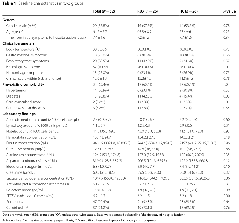 这52名参与者的基线特征总结于表1。RUX组患者平均(±SD)年龄为65.8±8.7岁,男性占57.7%。从出现症状到住院平均时间为7.2±1.5 d。其中有基础疾病17例(65.4%),糖尿病史11例(42.3%),高血压史6例(23.1%)。在治疗开始时,所有参与者都有发烧和至少一种神经系统症状。8例(30.7%)患者出现恶心和呕吐等消化系统症状,11例(42.3%)患者出现咳嗽和咳痰等呼吸道症状。6名(23.1%)参与者出现出血症状,表现为皮肤瘀斑。血小板中位数为45.0 (IQR 40.3-65.3) × 109/L。平均(±SD)病毒载量为6.2±1.5 log10拷贝/ ml。在基线时,根据计算机断层扫描(CT)检查,24名(92.3%)参与者合并肺炎,19名(73.1%)参与者合并证实或可能的IPA;可能的IPA必须包括至少一个宿主标准,一个临床标准和一个真菌学标准。