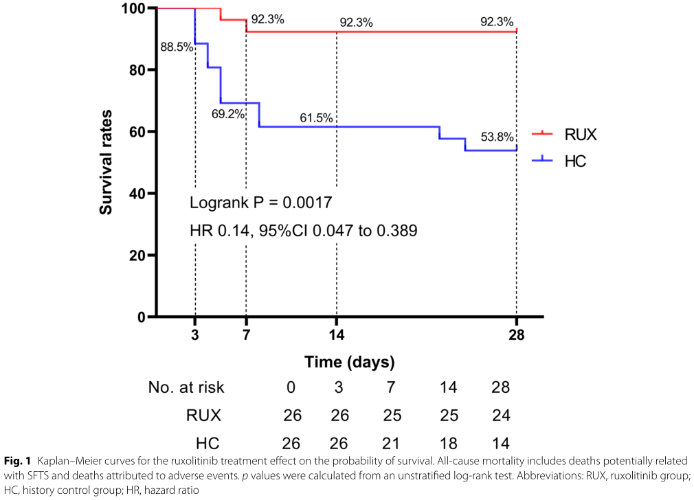 结果:在2022年9月16日至2023年9月16日期间,26名参与者被招募到ruxolitinib治疗组(RUX组)。RUX组28天总死亡率为7.7%,HC组为46.2% (P = 0.0017)。RUX组ICU住院比例(15.4% vs 65.4%, p < 0.001)和总住院费用显著低于对照组。在所有存活的参与者中,观察到神经系统症状、血小板计数、高铁蛋白血症的显著改善,以及血清SFTS病毒载量的绝对下降。6例(23.2%)患者出现治疗相关不良事件,8例(30.8%)患者出现恶化,无严重治疗相关不良事件报告。