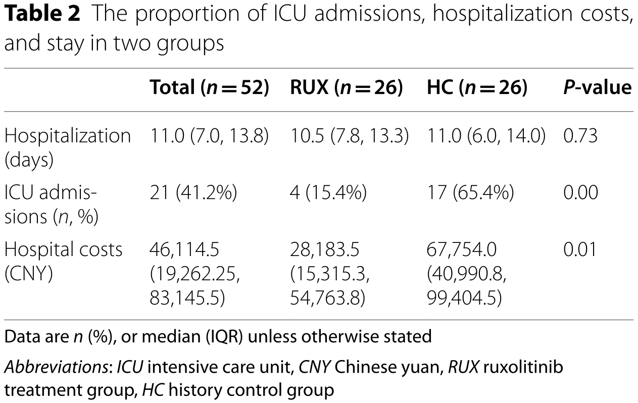 与HC组相比,RUX组ICU入院率明显减少(15.4% vs 65.4%, p < 0.001)。RUX组住院费用中位数为28183.5 (IQR 15315.3 - 54763.8)元人民币,显著低于HC组(67754.0 (IQR 40990.8 - 99404.5)元人民币,p = 0.01)。两组患者住院时间差异无统计学意义(表2)。