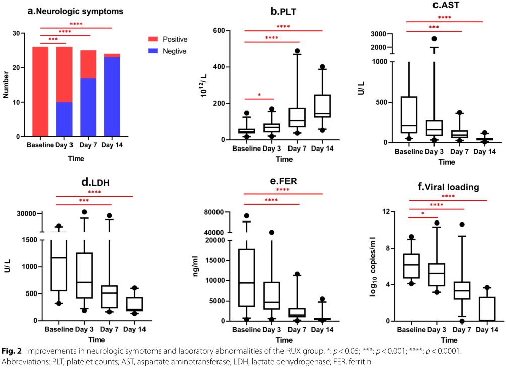 在RUX组存活的参与者中,在14天内观察到神经症状和实验室异常的实质性改善(图2)。我们观察到存活参与者的神经症状随着时间的推移逐渐缓解,第7天缓解71%,第14天缓解96%(图2a)。总体而言,血小板计数逐渐增加,并在1周时接近正常(图2b)。升高的天冬氨酸转氨酶(AST)、乳酸脱氢酶和高铁蛋白血症水平在2周内显著改善(图2c、d和e)。观察到血清SFTS病毒载量绝对下降(图2f)。