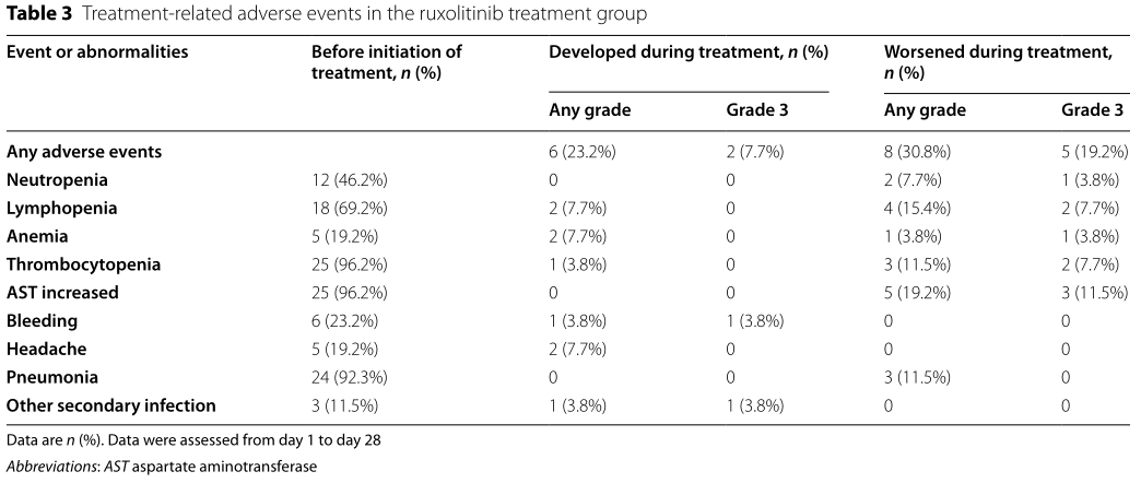 对于安全性终点,我们评估了可能与ruxolitinib不良反应相关的临床表现和实验室参数(表3)。6名患者(23.2%)出现治疗期间发展,其中2名患者(7.7%)出现3级, 8名患者(30.8%)出现恶化,其中5名患者(19.2%)出现3级。在任何情况下,它们都没有导致停药。24例患者在基线时出现肺炎,其中3例在1周内进展,1例在2周时改善。1例患者继发感染,肛周皮下脓肿,经1周抗生素治疗后好转。RUX组有4例ICU入院,2例死亡,但没有因ruxolitinib毒性引起的ICU入院或死亡。