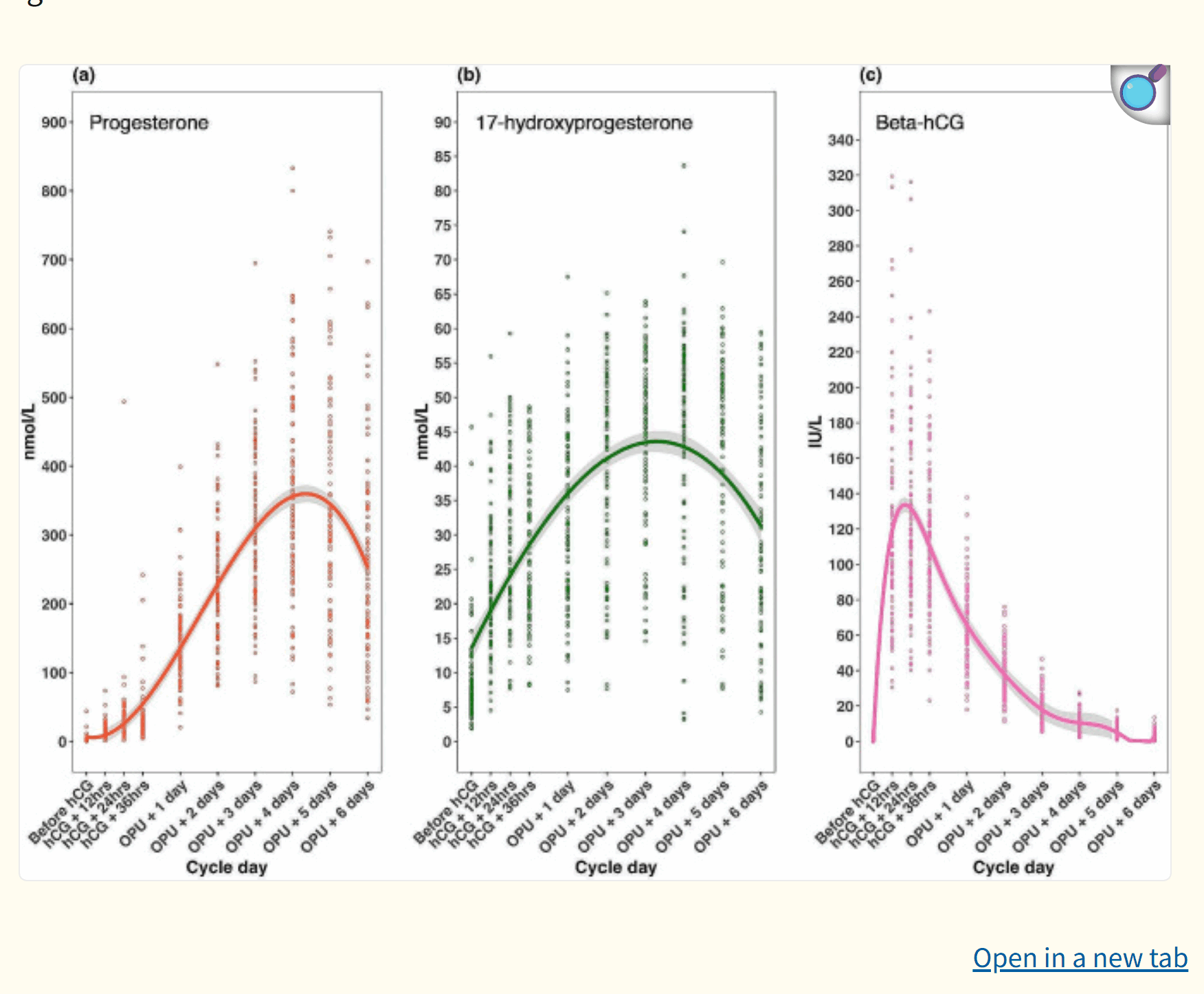 血清黄体酮和17-羟孕酮水平在hCG给药后的第二天开始升高,在卵母细胞拾取后四天达到峰值(分别为366±16nmol/L和44±1.6nmol/L),然后开始下降。最高血清hCG水平为126mIU/mL,在hCG触发后24小时观察到,随后逐渐下降(图1)。