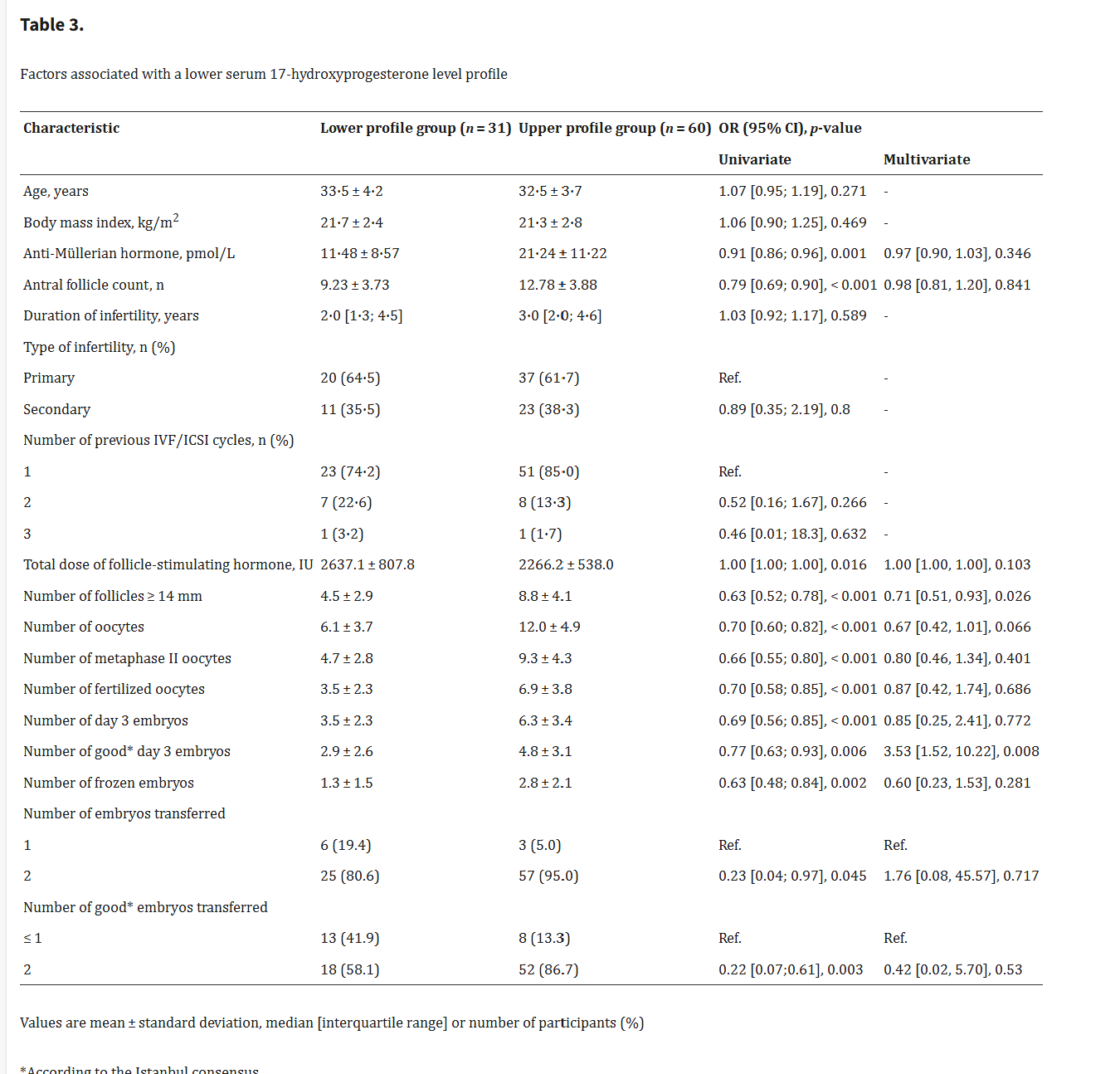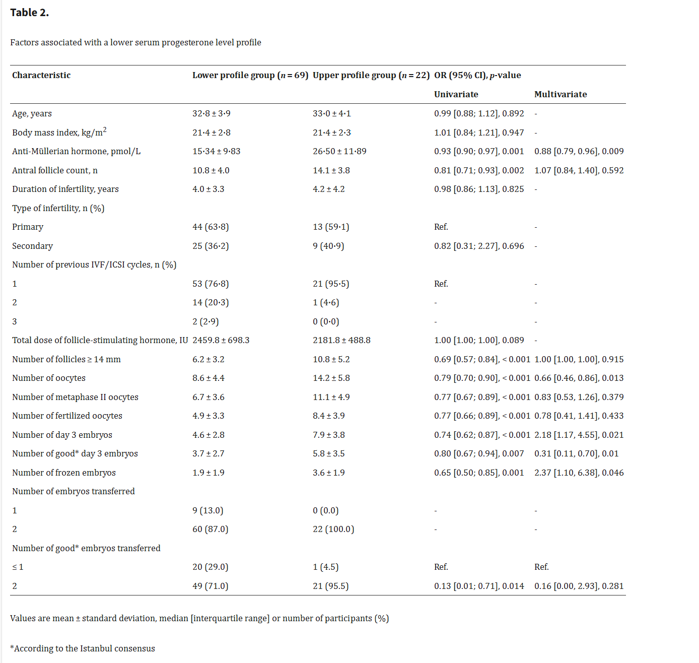 在多变量分析中,与较低黄体酮谱相关的因素是抗苗勒管激素水平、卵母细胞数量、第3天胚胎数量和第3天良好胚胎数量(表2)。在多变量分析中,与较低的17-羟孕酮谱相关的因素是≥14毫米的卵泡数量和良好的第3天胚胎数量(表3)。对于血清黄体酮和17-羟孕酮,在单变量分析中,移植的第3天良好胚胎的数量与较低的激素谱显着相关,但与多变量分析无关(表2和表3)。