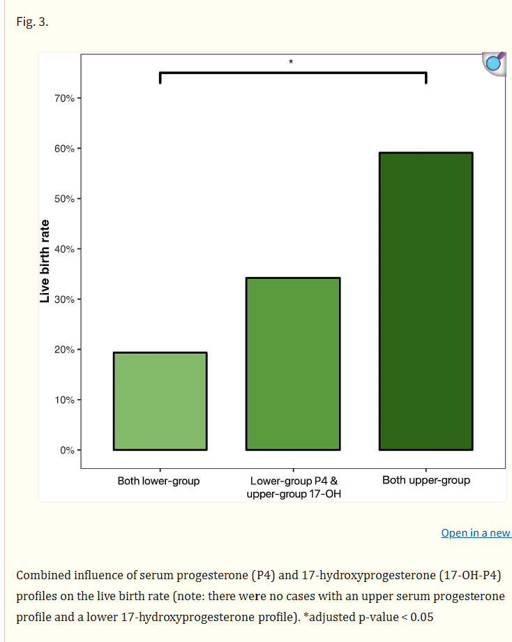 血清黄体酮和血清17-羟孕酮水平较低的个体活产率最低(6/31,19.4%),两种激素水平较高的个体活产率最高(13/22,59.1%);血清黄体酮水平较低且17-羟孕酮较高的女性活产率中等,并且没有参与者的17-羟孕酮/较高黄体酮水平较低(图3)。