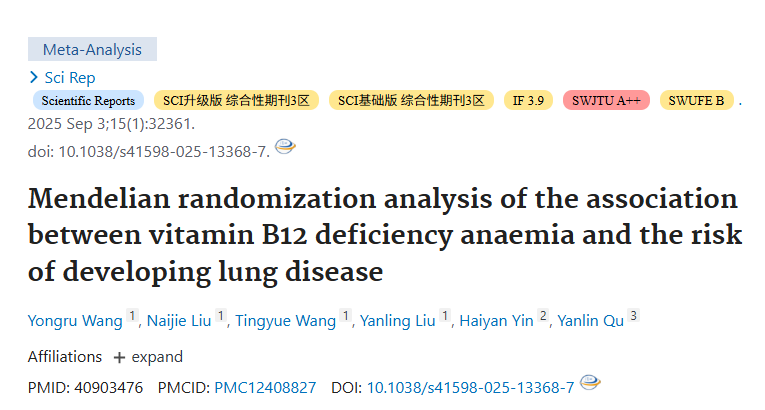 2025年9月3日,中国学者在《Sci Rep》发表一项孟德尔随机化(MR)研究,结合贝叶斯加权法,探讨维生素B12缺乏性贫血与肺部疾病(肺纤维化[PF]、特发性肺纤维化[IPF]、嗜酸性粒细胞性哮喘[EA]、肺鳞状细胞癌[LUSC]、慢性阻塞性肺疾病[COPD]及肺栓塞[PE])之间的因果关系。