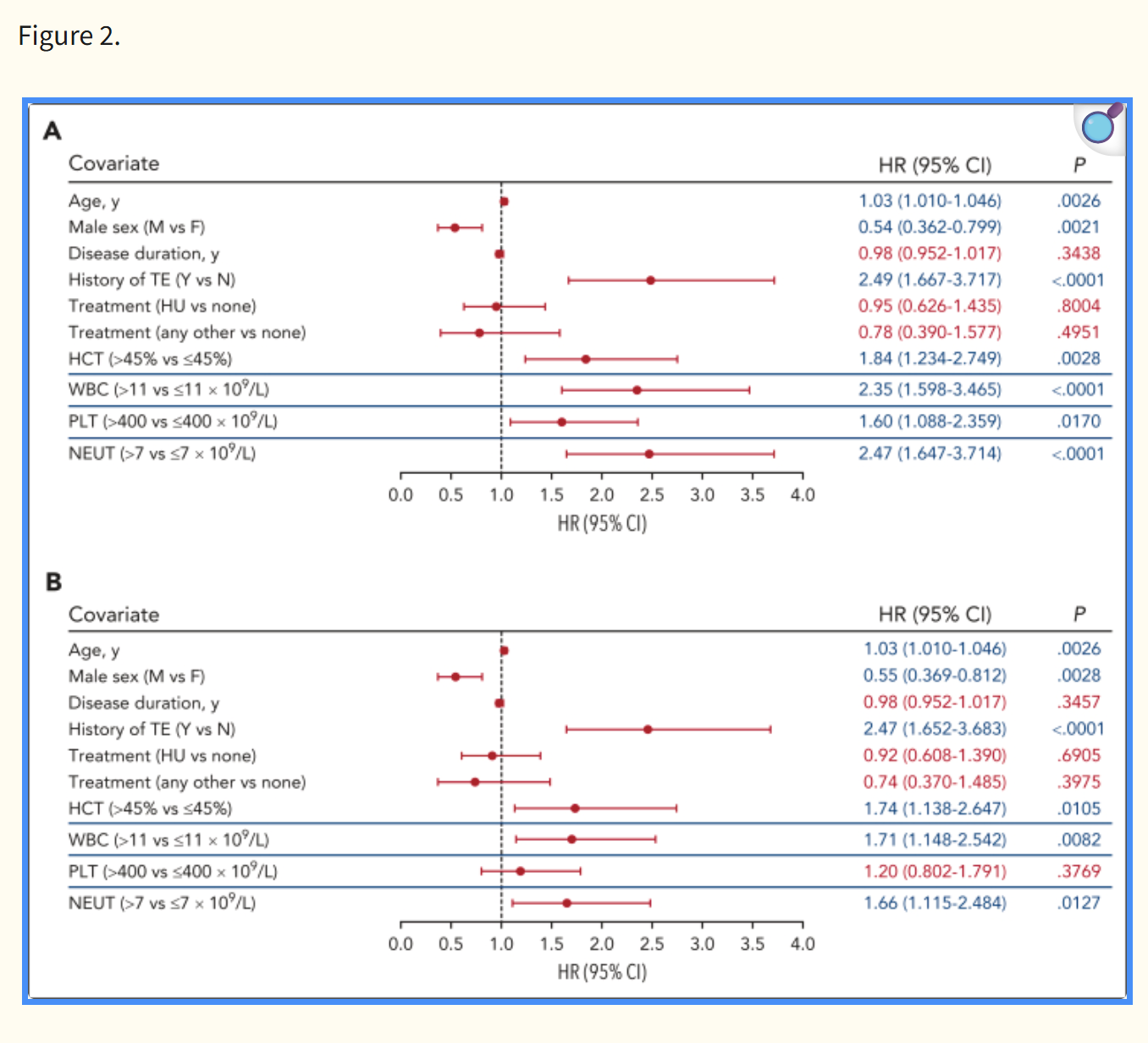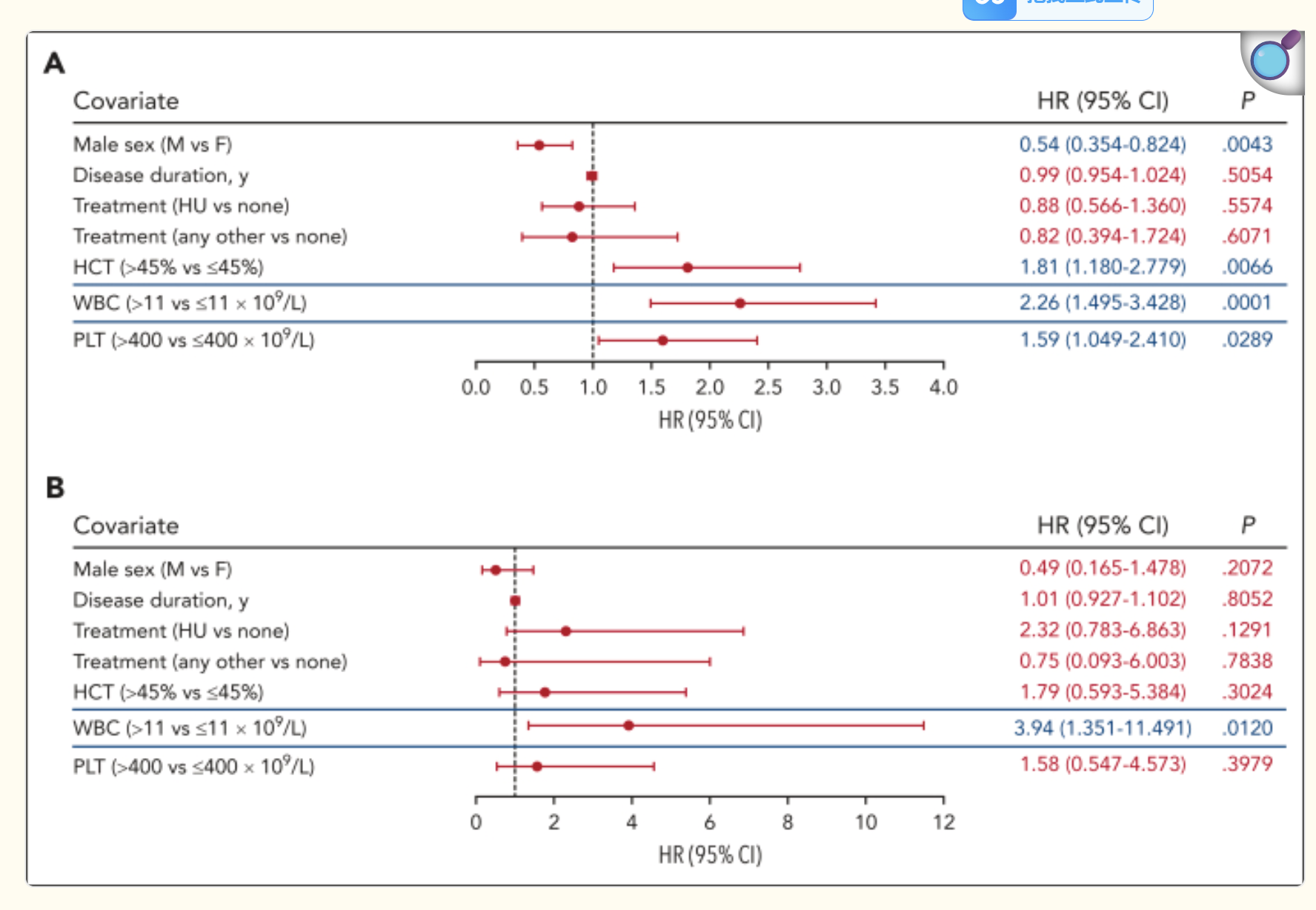 对入组后期间发生的首次TE进行时间依赖性协变量分析。每种血细胞计数类型(血细胞比容、白细胞、血小板和中性粒细胞)使用TE前收集的最新实验室值以及年龄、性别、疾病持续时间、TE病史和治疗的协变量独立建模。TE发生与血细胞比容水平>45% vs ≤45%(P=0.0028)、白细胞计数>11 × 109/L vs ≤11 × 109/L(P <0.0001)、血小板计数>400 × 109/L vs ≤400 × 109/L(P=0.0170)和中性粒细胞绝对计数>7×109/L vs ≤7 × 109/L(P <0.0001)。还探索了白细胞计数(≥7× 109/L至<8.5 × 109/L与<7 × 109/L和≤8.5 × 109/L至<11 ×109/L与<7 × 109/L)和血小板计数(>600 × 109/L)的替代阈值,以进一步表征上述观察到的关联的显着性,并且没有观察到血细胞计数和TE发生之间的显着关联。