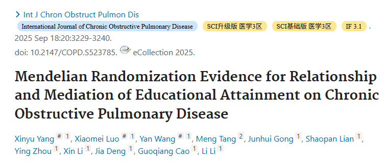2025年9月18日,中国学者在《Int J Chron Obstruct Pulmon Dis》发表一项孟德尔随机化(MR)研究,通过MR方法,探讨教育水平(EA)与慢性阻塞性肺病(COPD)发病和住院之间的因果关系,并进一步利用多变量MR(MVMR)和两步MR,分析EA对COPD的潜在中介机制。
