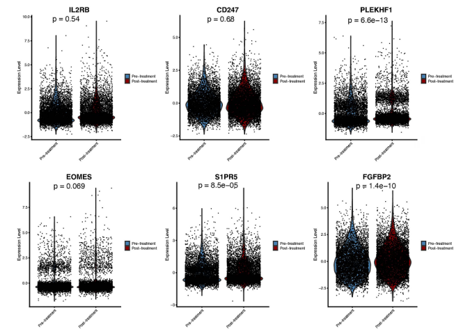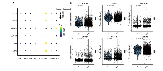 作者量化了这六个基因在AS患者和健康对照者外周血中的表达水平,结果显示,表达最高的基因是FGFBP2,而表达最低的基因是PLEKHF1(图6)。值得注意的是,与健康供体相比,这六个基因中有五个在AS患者中的表达显著降低,分别是CD247、EOMES、FGFBP2、IL2RB和S1PR5。
