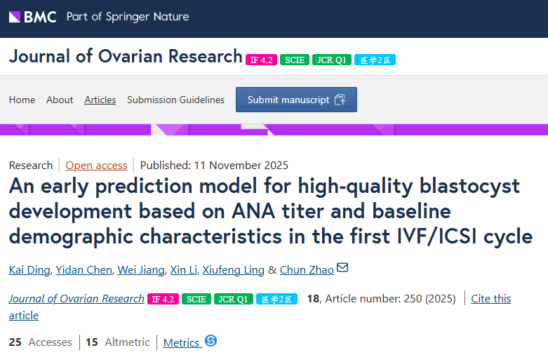 2025年11月,南京医科大学附属妇产医院的Chun Zhao教授和Kai Ding、Yidan Chen教授团队在Journal of Ovarian Research发表了一项回顾性研究。结果显示,女性年龄、AMH水平、基础窦卵泡计数(AFC)、ANA滴度以及自然流产次数是优化囊胚发育的独立预测因素。基于这五个易于获取的基线特征构建的预测模型具有可接受的临床预测能力,有助于在胚胎培养前对不孕患者进行个体化诊疗。