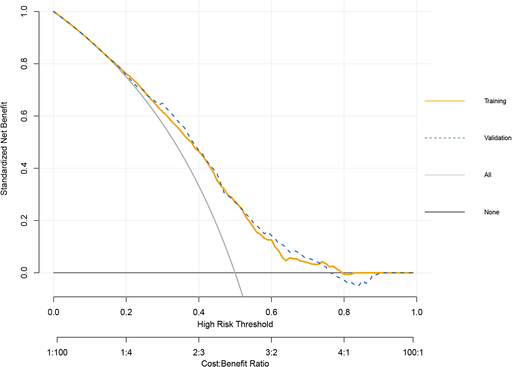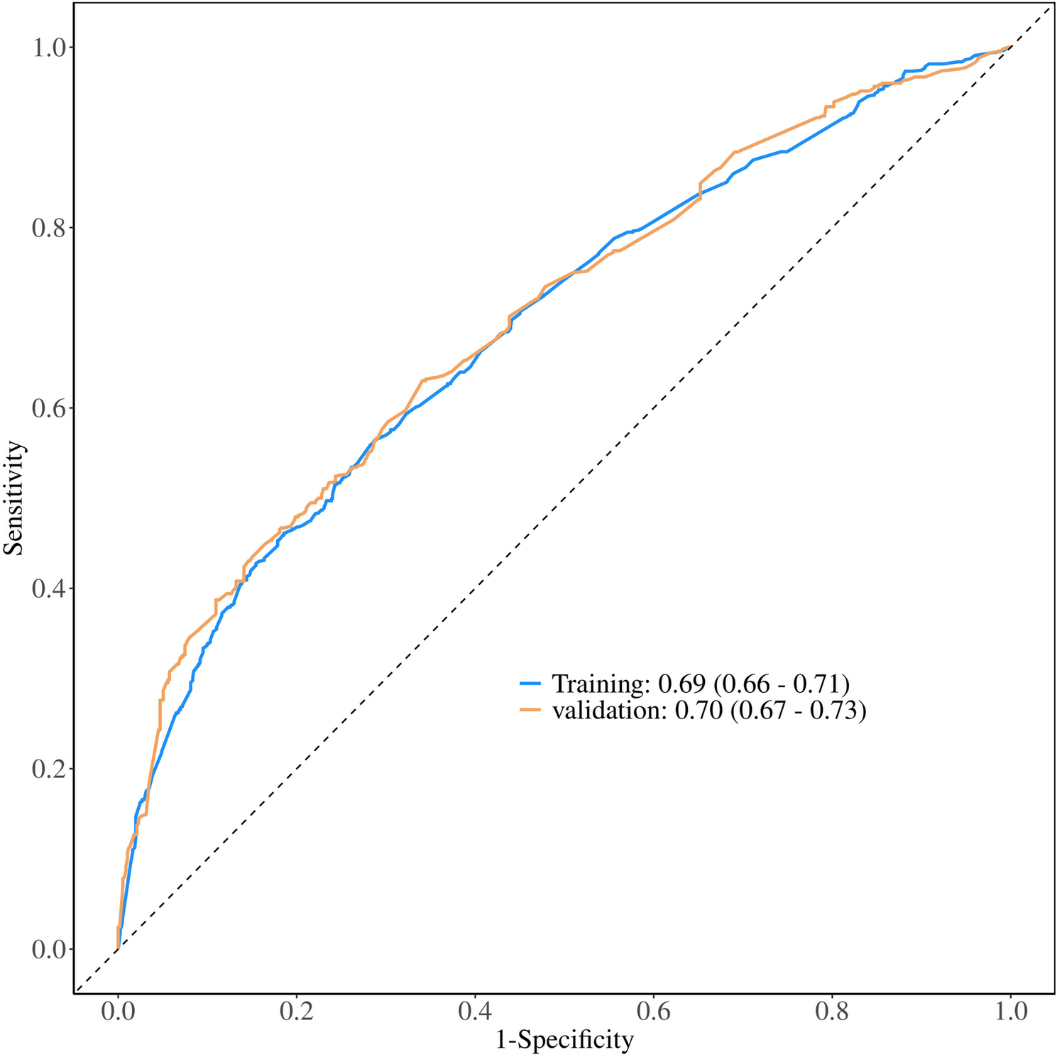 基于上述五个关键变量的多变量逻辑回归模型显示,在训练集中,模型的AUC为0.69(95% CI: 0.66-0.71),在验证集中,AUC为0.70(95% CI: 0.67-0.73)。训练集和验证集的校准曲线(Hosmer-Lemeshow检验P值分别为0.735和0.099)均显示预测概率与实际概率高度一致。决策曲线分析(DCA)也表明该列线图模型具有良好的临床净收益。这些结果证实,该预测模型具有可接受的预测性能和良好的准确性,可用于临床。(图 2, 图 3, 图 4, 图 5)