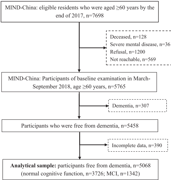 本研究采用基于社区的横断面设计,依托“中国农村延缓痴呆和失能多模式干预(MIND-China)”项目基线数据。研究目标人群为山东省阳谷县闫楼镇所有60岁及以上注册居民(n=7698),最终纳入5068名参与者,排除标准包括已确诊痴呆(DSM-IV标准)或关键信息缺失者。MCI及其亚型(aMCI和naMCI)依据Petersen标准操作化定义,整合以下要素:(1)主观认知抱怨或临床痴呆评分(CDR≥0.5);(2)神经心理学测试评估四大认知域(记忆、语言、注意力、执行功能),客观损害定义为z评分≥1.0 SD低于同年龄-教育组均值;(3)日常生活能力基本保留(ADL量表);(4)临床医师共识诊断。结局指标包括MCI患病率及与社会人口特征、生活方式(吸烟、饮酒)、临床疾病(高血压、中风等)和APOE基因型的关联。