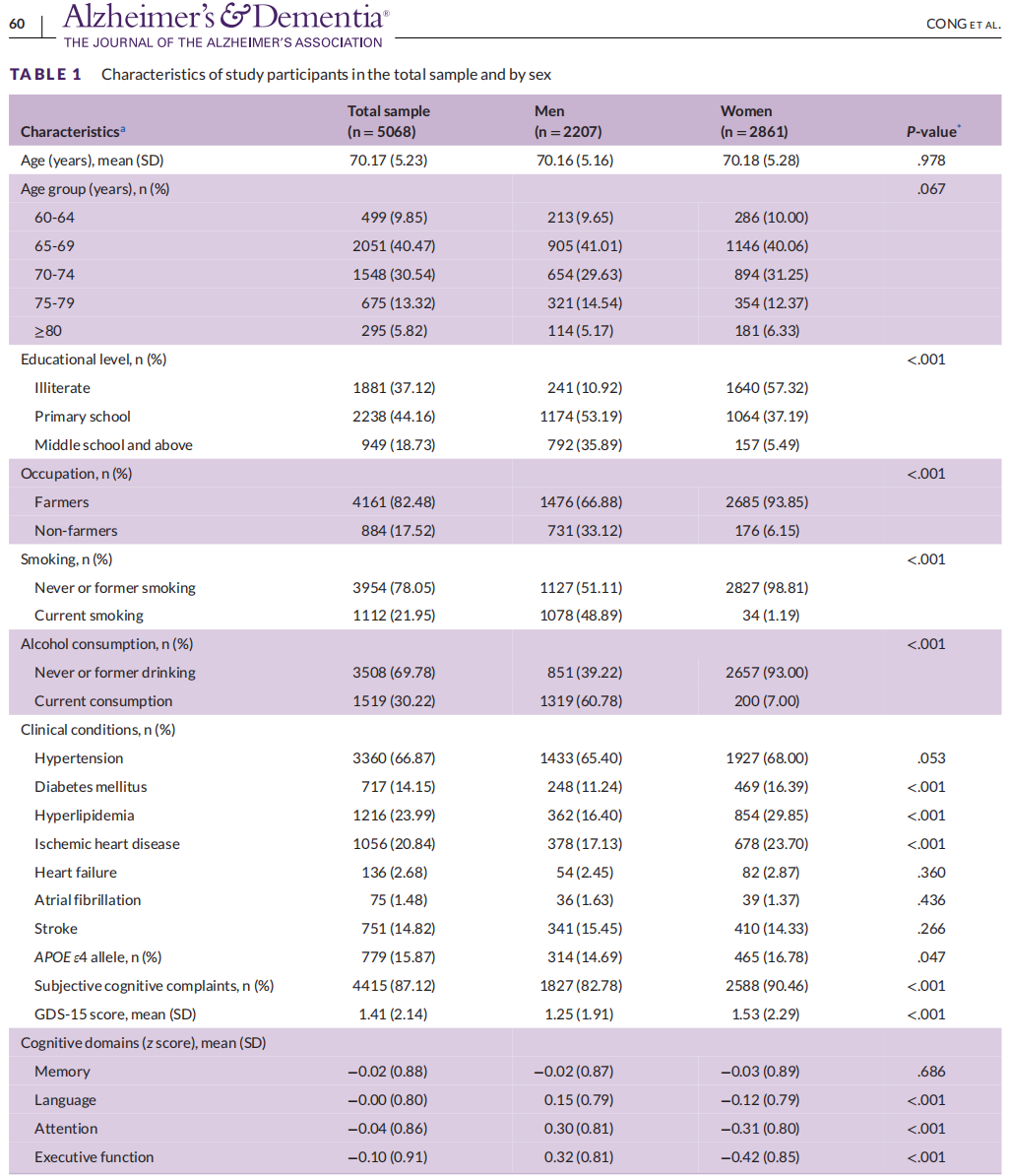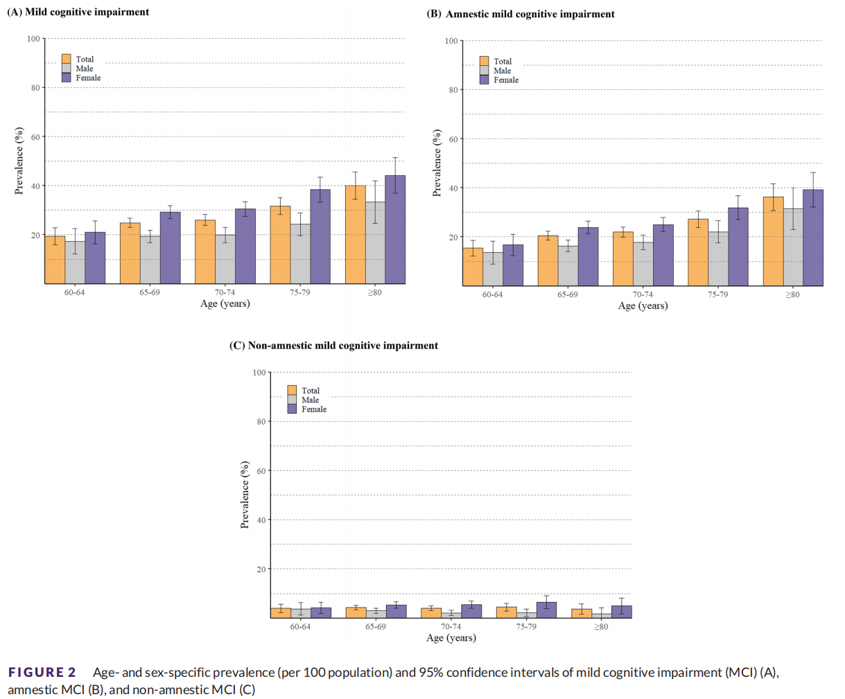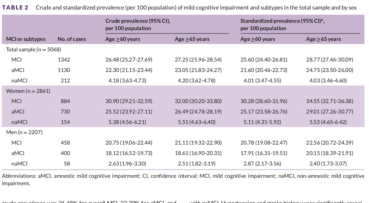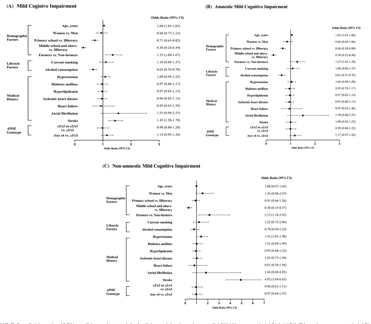 2023年1月,山东大学山东省医院神经内科团队在《Alzheimer's & Dementia》发表了一项大规模社区横断面研究。该研究纳入5068名农村老年人,结果显示MCI总患病率为26.48%,其中遗忘型MCI(aMCI)占主导(84.20%);多因素分析表明,低教育、务农、非饮酒及中风史与MCI风险显著相关,而APOE ε4基因型无显著关联。作者结论指出,农村MCI患病率高且以记忆障碍为主,防控需关注社会人口因素和血管管理。