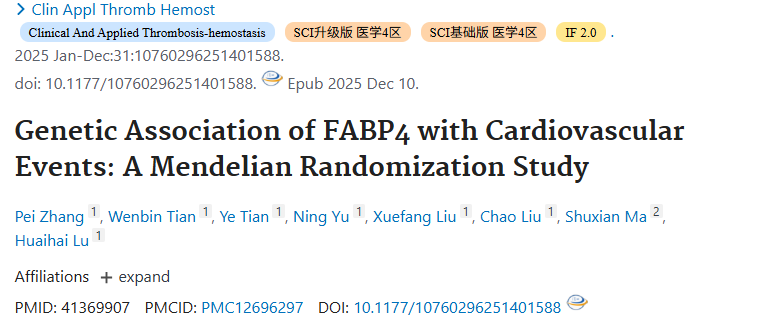 2025年12月,中国学者在《Clin Appl Thromb Hemost》发表题为《Genetic Association of FABP4 with Cardiovascular Events: A Mendelian Randomization Study》的研究。既往观察性研究关于脂肪酸结合蛋白4(FABP4)与心血管疾病(CVD)之间相关性的结果存在矛盾。该研究利用遗传学方法探讨FABP4与不良心血管(CV)事件之间的因果关联。
