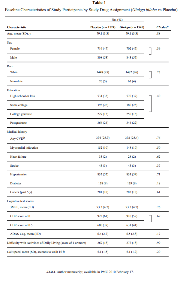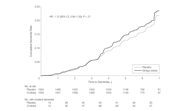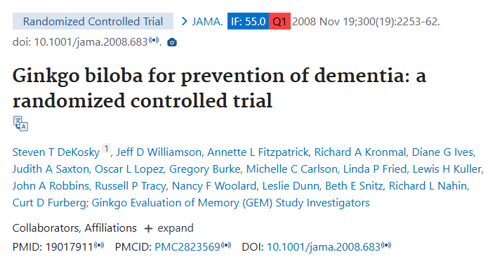 2008年11月,维吉尼亚大学(第一作者单位)Steven T. DeKosky教授团队在JAMA(《美国医学会杂志》,中科院1区,)发表了一项随机、双盲、安慰剂对照临床试验(GEM研究),结果显示:在随访中位时间为6.1年的观察期内,每日两次服用120mg银杏叶提取物并未能有效降低老年人的痴呆发生率 。研究最终得出结论,银杏叶提取物不能推荐用于预防痴呆或阿尔茨海默病。