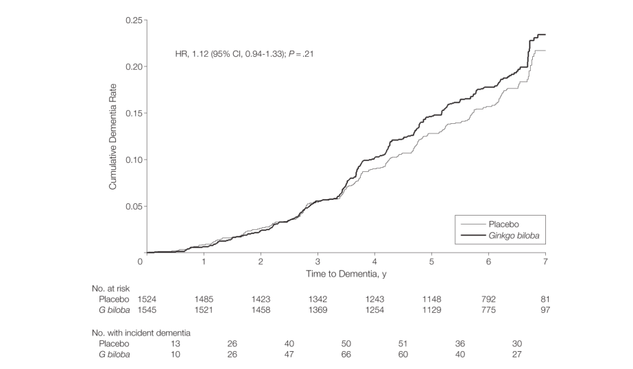 在研究期间共确诊523例痴呆,其中银杏组277例(17.9%),安慰剂组246例(16.1%),两组间差异无统计学意义(HR 1.12, 95% CI 0.94-1.33; P=.21)。结果表明,每日240mg的银杏叶提取物并不能预防或延迟全因痴呆的发生。
