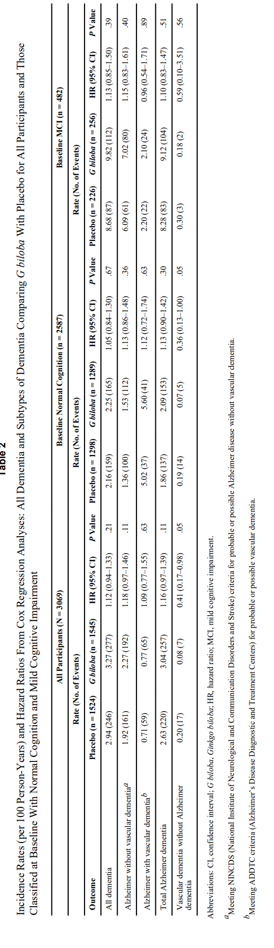银杏叶提取物对于基线存在MCI的受试者进展为痴呆的速率也没有显著影响(HR 1.13, 95% CI 0.85-1.50; P=.39)。该结果否定了银杏叶提取物在痴呆高风险人群中具有二级预防价值的假设。