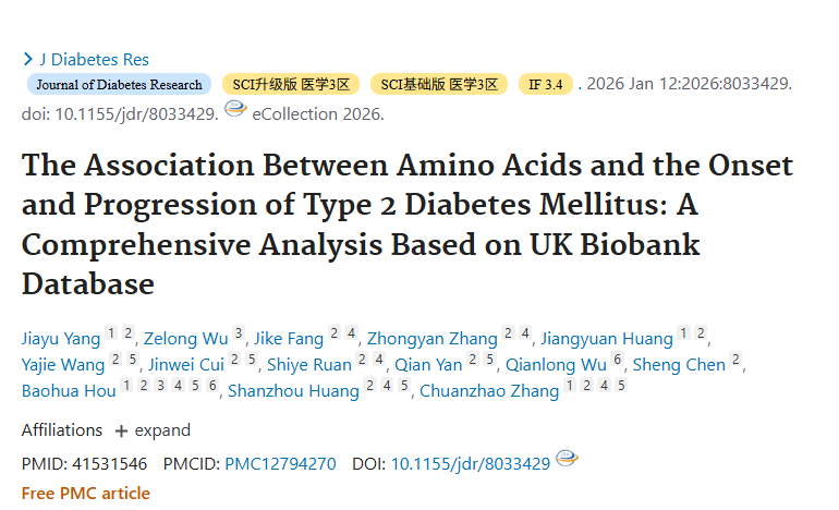 2026年1月,中国学者在《Journal of Diabetes Research》发表题为《The Association Between Amino Acids and the Onset and Progression of Type 2 Diabetes Mellitus: A Comprehensive Analysis Based on UK Biobank Database》的研究。通过采用LASSO回归分析,并结合孟德尔随机化(MR),以探索氨基酸(AAs)水平与2型糖尿病(T2DM)之间的因果关系。