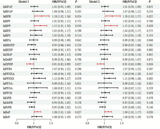 GLM分析显示(图1),3种EDCs与TA风险显著正相关:双酚B(BPB,OR=1.18,95%CI:1.03-1.37)、双酚P(BPP,OR=1.15,95%CI:1.01-1.30)、丁基对羟基苯甲酸酯(BuP,OR=1.09,95%CI:1.01-1.17);而邻苯二甲酸二苯酯(DPHP)与TA风险显著负相关(OR=0.91,95%CI:0.83-0.99),其余EDCs未观察到显著关联。