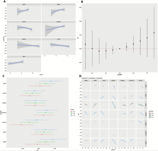24种EDCs纳入LASSO回归模型,使用10种交叉验证,确定了模型的关键参数值(λ=0.02),最终筛选出7种与TA相关的关键EDCs(BPB、BPP、DPHP、PFHxS、EtPB、PrPB和BuP)(图2)。BKMR模型显示:BPB、BPP和BuP与TA发生的风险呈正相关,而DPHP与TA发生的风险呈负相关(图3A)。当该7种EDCs混合暴露水平≥第35百分位数时,TA风险呈剂量依赖性升高(图3B)。BPB和BuP的高浓度显著增加了TA的风险(图3C)。这7种关键内分泌干扰物之间无显著交互作用,效应主要是加和性的(图3D)。