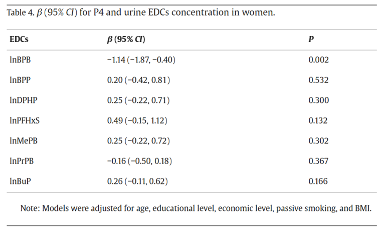 研究采用了GLM分析来确定P4与TA之间和EDCs与P4之间的关系。结果表明:早期妊娠时血P4水平与TA发病风险之间存在显著负相关(OR = 0.92,95%CI:0.91,0.94,P < 0.001)(表3)。