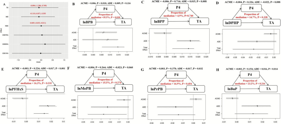 多污染物中介模型表明:血清中的P4在7种EDCs混合暴露中无显著中介作用(图4A)。单污染物中介作用分析结果显示(图4B-H):中介分析表明,P4显著介导了BPB对TA的有害效应(ACME = 0.006,P = 0.010),即BPB可能通过降低孕妇P4水平,间接增加TA风险,而在其他EDCs与TA的关联中未观察到显著中介效应。