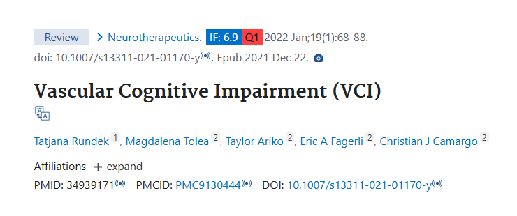 2021年12月,迈阿密大学米勒医学院神经病学系Tatjana Rundek教授团队在Neurotherapeutics发表了一项综述研究。结果显示,慢性年龄相关的脑血流失调及神经血管单元损伤是VCI的核心机制,中年期的高血压、糖尿病等危险因素会显著增加晚期痴呆风险,而针对多重血管危险因素的早期综合干预是目前最有效的预防和治疗策略。