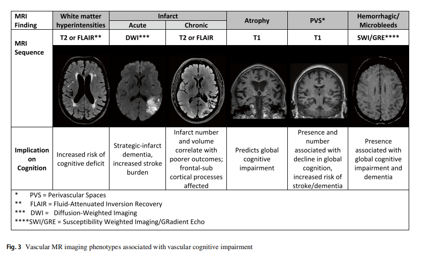 本研究的研究设计类型为全面叙述性综述,旨在对领域内最新文献和共识进行系统梳理。在纳入排除标准方面,本研究涵盖的目标人群为暴露于长期血管危险因素(如高血压、糖尿病、肥胖等)以及存在明确心脑血管病变(包括脑小血管病及大血管动脉粥样硬化)的成年及老年人群。在分组与疾病界定上,研究根据国际血管性认知障碍分类共识(VICCCS),将该人群分层为轻度VCI(仅影响单个认知域且基本不影响日常生活)与重度VCI(包括卒中后痴呆、皮层下缺血性痴呆、多发梗死性痴呆和混合性痴呆)。研究的核心结局指标包含认知域的衰退表现(如执行功能、处理速度下降)以及脑小血管病的神经影像学结构标志物(如白质高信号、微小梗死、血管周围间隙、微出血等),这些结构指标依赖特定核磁共振(MRI)序列(如T2、FLAIR、DWI、SWI)进行三维成像与定量获取。