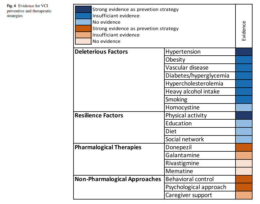 VCI占所有痴呆诊断的20%至40%,如果在中年时期合并高血压、高血脂、糖尿病和吸烟,每增加一种因素都会使痴呆风险按统计学剂量依赖的方式增加20%至40%。这表明中年时期危险暴露的累积对晚年神经网络衰退起到了成倍的放大作用(数据来自于正文Table 1)。