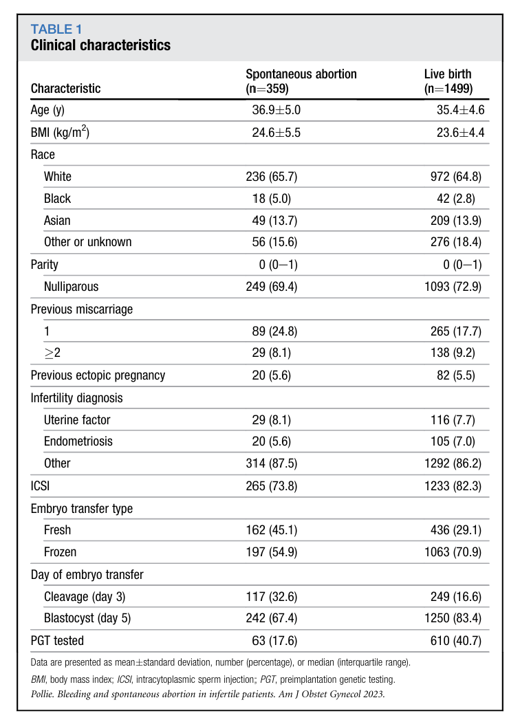 本研究为回顾性队列研究,纳入2017年1月-2019年12月威尔康奈尔医学中心接受自体胚胎移植并经超声证实单胎宫内妊娠的不孕患者共1858例,其中359例自然流产,1499例活产。研究纳入孕8周前出现阴道出血的患者,同时收集孕6周(妊娠6⁰⁄至6⁶⁄₇周)和孕7周(妊娠7⁰⁄₇至7⁶⁄₇周)的顶臀长(CRL)、胚胎心率(FHR)超声测量数据。
