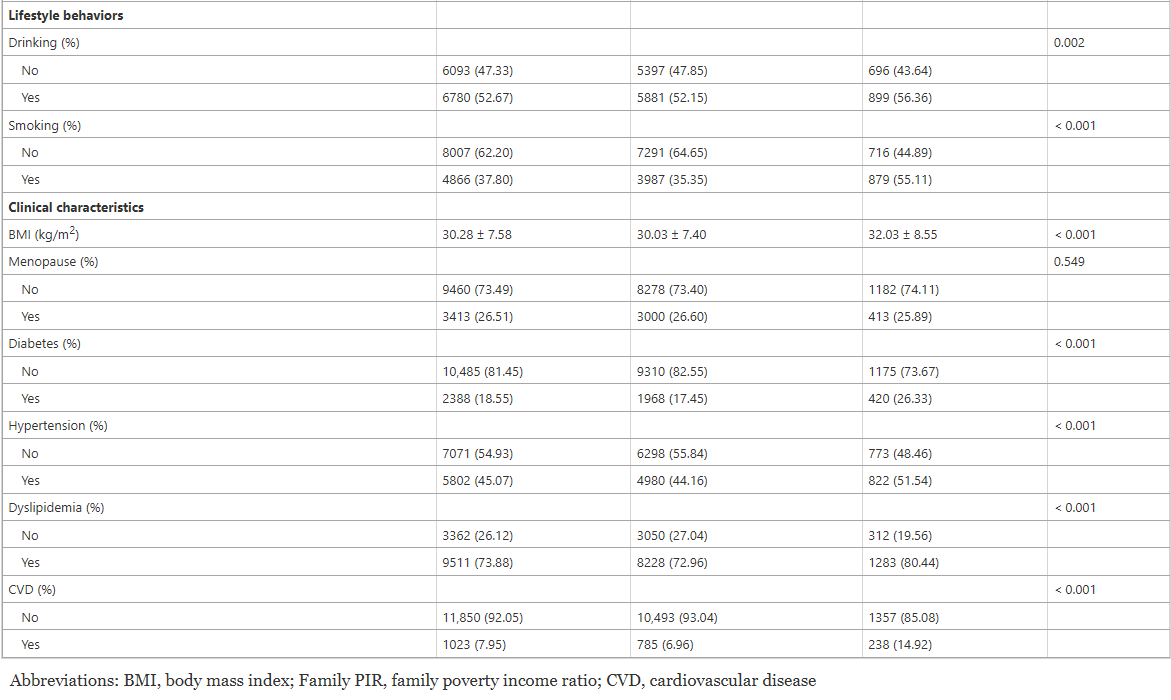 在总样本量中,共有 1,595 人报告有抑郁症状(PHQ-9 ≥ 10),占研究人群的 12.39%。PHQ-9 分数较高的女性参与者更有可能受教育程度较低、收入较低、更有可能成为当前吸烟者和饮酒者、更有可能拥有较高的体重指数 (BMI),并患有糖尿病、高血压、高脂血症和心血管疾病。此外,种族和婚姻状况与抑郁症状相关,未婚、丧偶、离婚和配偶分居也与较高的 PHQ-9 评分相关。与无抑郁症状的妇女相比,有抑郁症状的妇女年龄、初潮年龄、初次分娩年龄和末次分娩年龄较小。