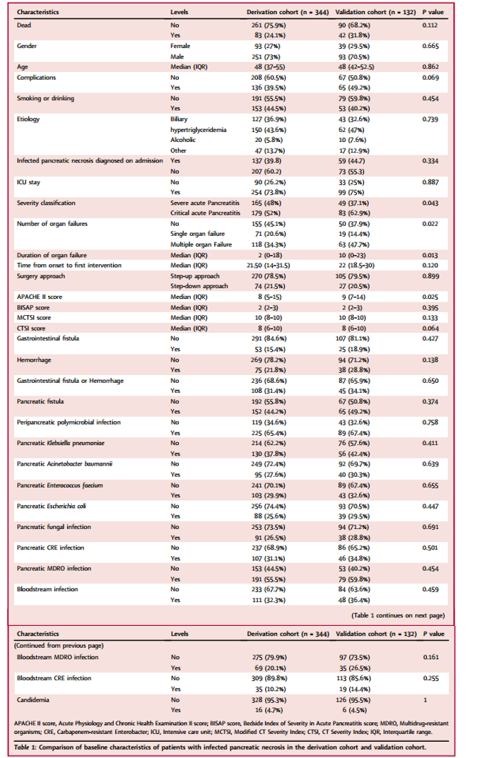 研究人群的临床特征见表1。模型开发队列中有344例患者,外部验证队列中有132例患者,其中死亡患者分别为83例(24.1%)和42例(31.8%)。在模型开发队列中,73.0%为男性,27.0%为女性。该队列的中位年龄为48(37-55)岁。验证队列的危重急性胰腺炎和多器官衰竭(MOF)发生率显著升高,器官衰竭的中位持续时间更长,APACHE II评分较高(P < 0.05)。衍生队列与验证队列在性别、年龄、病因等基线特征上无显著差异,但验证队列中危重急性胰腺炎(62.9% vs. 52%)和多器官衰竭(47.7% vs. 34.3%)比例更高,且APACHE II评分中位数更高(9 vs. 8),提示验证队列患者病情更重。(表1)