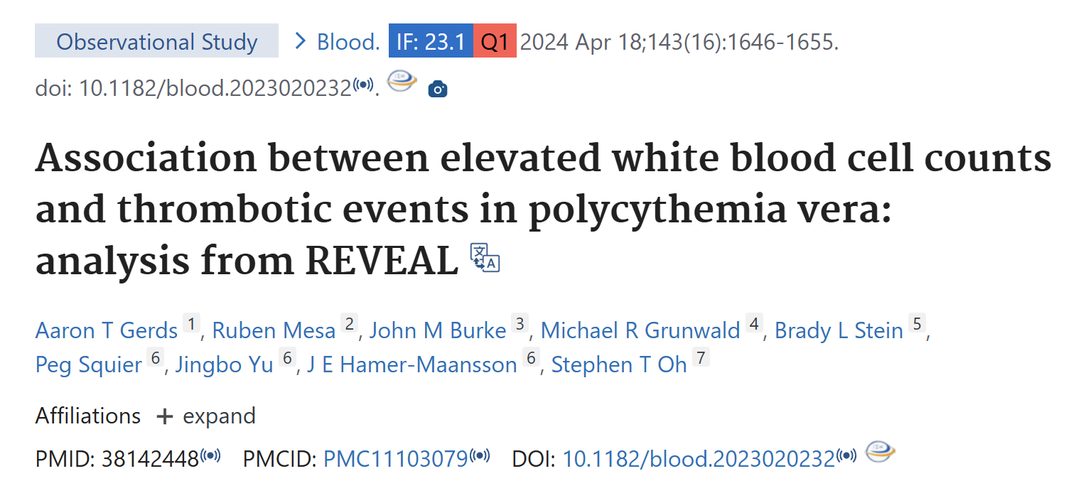 2024年4月18日,在《Blood》上一篇名为“Association between elevated white blood cell counts and thrombotic events in polycythemia vera: analysis from REVEAL”的研究论文被发表,本研究旨在评估真性红细胞增多症患者白细胞计数升高与血栓事件之间的关联。
