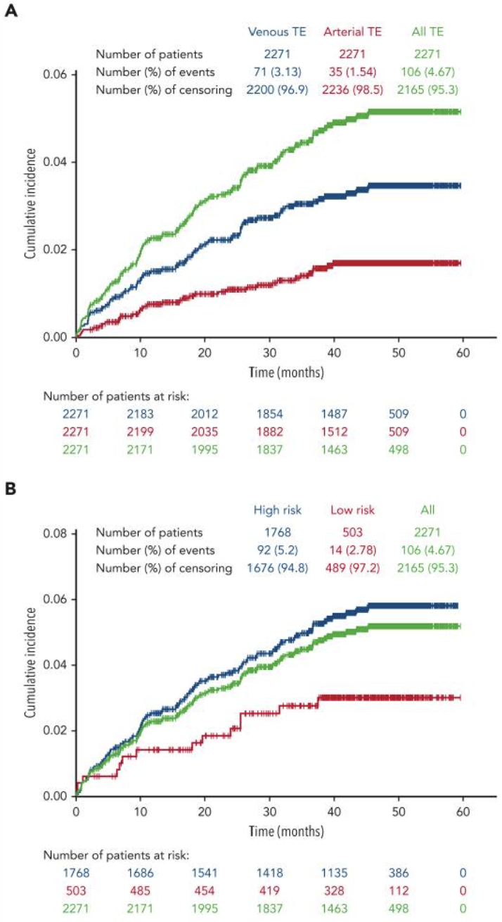 在本研究纳入的2271名患者中;106名患者(4.7%)共有142例TE,整个入组期间的发生率为每100名患者年1.36例。在研究期间报告的106例TE患者中,大多数经历了次TE(n86;81.1%),其中20例(18.9%)经历了2至5次TE(补充表3)。此外,在入组前有TE病史的456例患者中,38例(8.3%)在研究期间经历过TE;在研究期间经历过TE的患者中,有35.8%在入组前有TE病史。静脉TE比动脉TE更频繁,入组时高PV患者比低危PV患者更有可能出现TE(图1A-B)。在总共142例TE中,100例为静脉事件,最常见的是深静脉血栓形成(n=43),42例为动脉,最常见的是短暂性脑缺血发作(n=15)。在研究期间有TE病史的患者经历的53例TE中,有41例为静TE,最常见的是深静脉血栓形成(n=19),12例是动脉事件,最常见的是短暂性脑缺血发(n=5)。在研究期间接受TE的106名患者中,69.8%在入组时接受阿司匹林治疗,23.6%接受抗凝治疗。与学术中心(4.7%,n=18)相比,社区(4.9%,n=81)的TE患者比例相似;在未指定类型治疗中心登记236 名患者中,有7名患有TE。