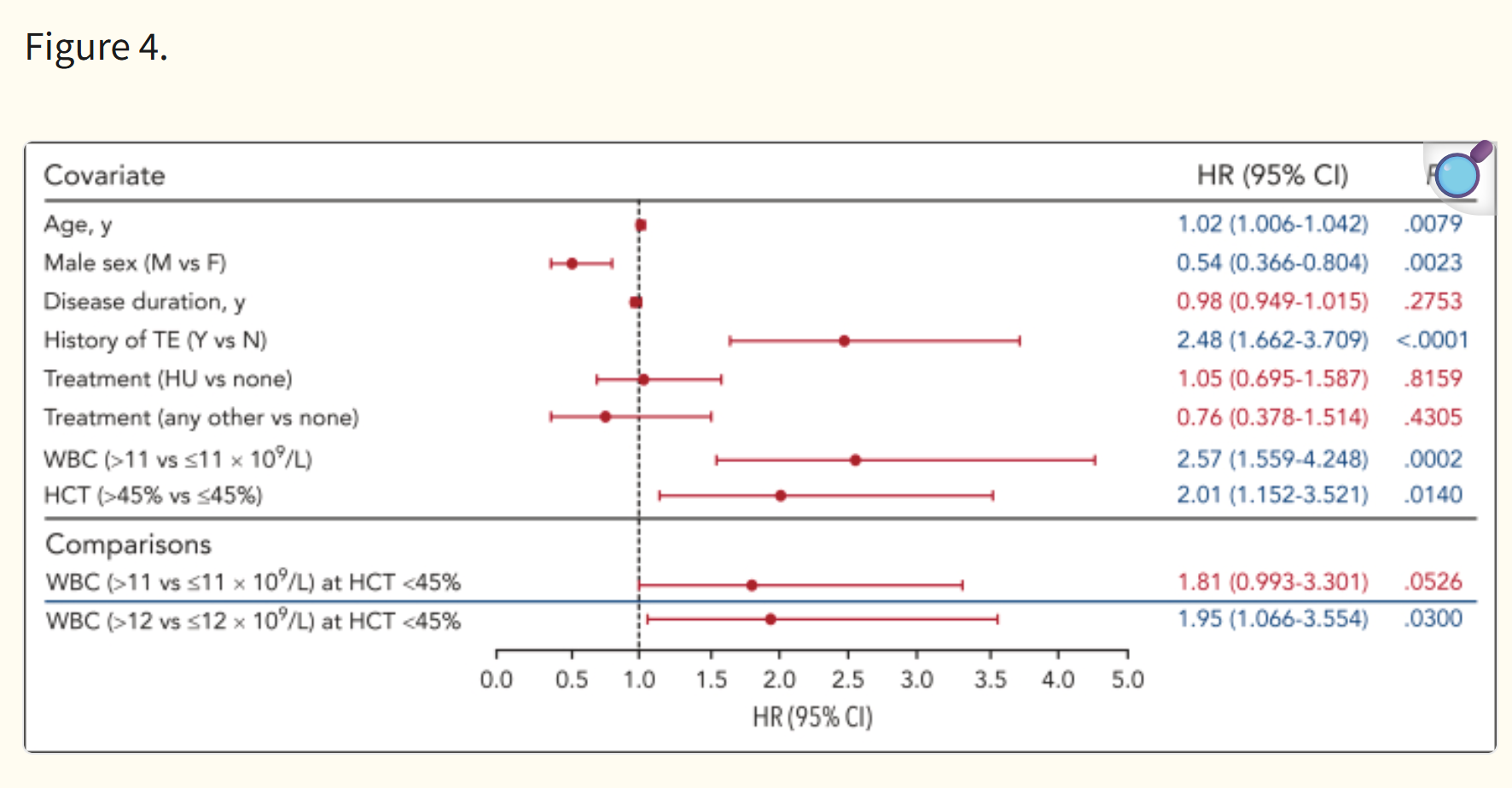 对入组后期间发生的首次TE进行时间依赖性协变量分析。每种血细胞计数类型(血细胞比容、白细胞、血小板和中性粒细胞)使用TE前收集的最新实验室值以及年龄、性别、疾病持续时间、TE病史和治疗的协变量独立建模。TE发生与血细胞比容水平>45% vs ≤45%(P=0.0028)、白细胞计数>11 × 109/L vs ≤11 × 109/L(P <0.0001)、血小板计数>400 × 109/L vs ≤400 × 109/L(P=0.0170)和中性粒细胞绝对计数>7×109/L vs ≤7 × 109/L(P <0.0001)。还探索了白细胞计数(≥7× 109/L至<8.5 × 109/L与<7 × 109/L和≤8.5 × 109/L至<11 ×109/L与<7 × 109/L)和血小板计数(>600 × 109/L)的替代阈值,以进一步表征上述观察到的关联的显着性,并且没有观察到血细胞计数和TE发生之间的显着关联。