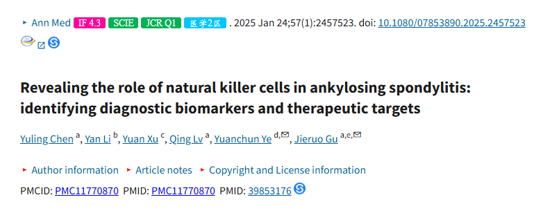 强直性脊柱炎(AS)的诊断与治疗,或许即将迎来全新的生物标志物!一项发表在《Ann Med》杂志上的研究,通过先进的生物信息学分析,精准锁定自然杀伤(NK)细胞在AS中的关键作用,并成功揪出6个与之相关的“核心基因”。它们不仅有望成为精准诊断的利器,更可能为未来治疗打开新的大门。快来一起看看这项有趣的研究吧!