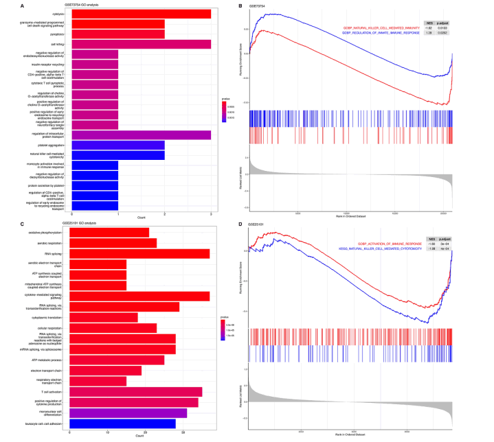 在GSE73754中的AS和健康样本之间共鉴定出88个上调基因和43个下调基因,在GSE25101中鉴定出94个上调基因和107个下调基因。DEG的GO富集分析表明GSE73754中涉及NK细胞介导的细胞毒作用(图1A),而在GSE25101中涉及细胞因子产生的正向调控(图1C)。GSEA分析进一步证实了GSE73754和GSE25101数据集中NK细胞介导的免疫的富集,具有统计学意义(图1B,D)。