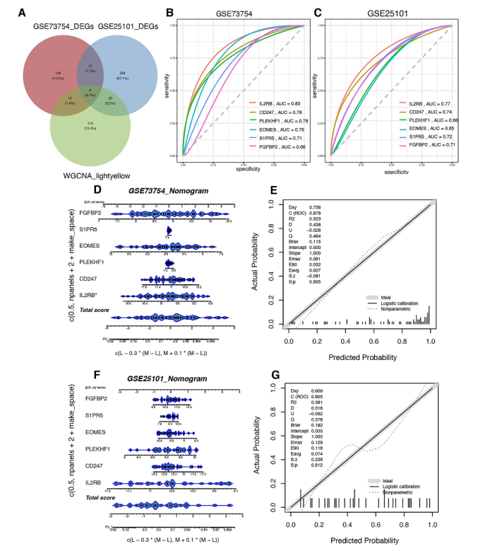 使用维恩图确定了6个关键基因(IL2RB、CD247、PLEKHF1、EOMES、S1PR5、FGFBP2)(图3A)。使用ROC曲线和AUC值评估了这些基因的诊断价值,发现AUC值范围为0.65至0.87,表明诊断价值中等到高等(图3B-C)。然后,使用逻辑回归构建了诊断预测模型,并使用列线图将结果可视化(图3D-F)。通过校准测试,p值为0.935(GSE73754)和0.812(GSE25101),表明模型拟合良好。GSE7375的AUC值为0.878,GSE25101的AUC值为0.805,表现出良好的判别能力(图3E-G)。