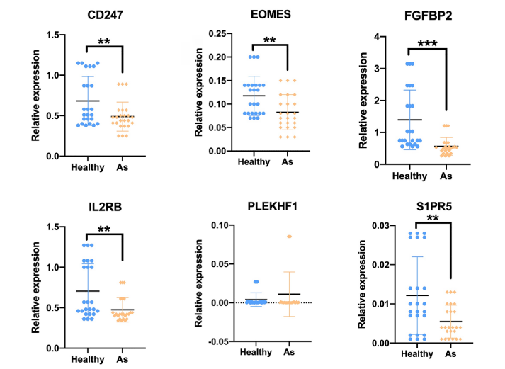 作者量化了这六个基因在AS患者和健康对照者外周血中的表达水平,结果显示,表达最高的基因是FGFBP2,而表达最低的基因是PLEKHF1(图6)。值得注意的是,与健康供体相比,这六个基因中有五个在AS患者中的表达显著降低,分别是CD247、EOMES、FGFBP2、IL2RB和S1PR5。