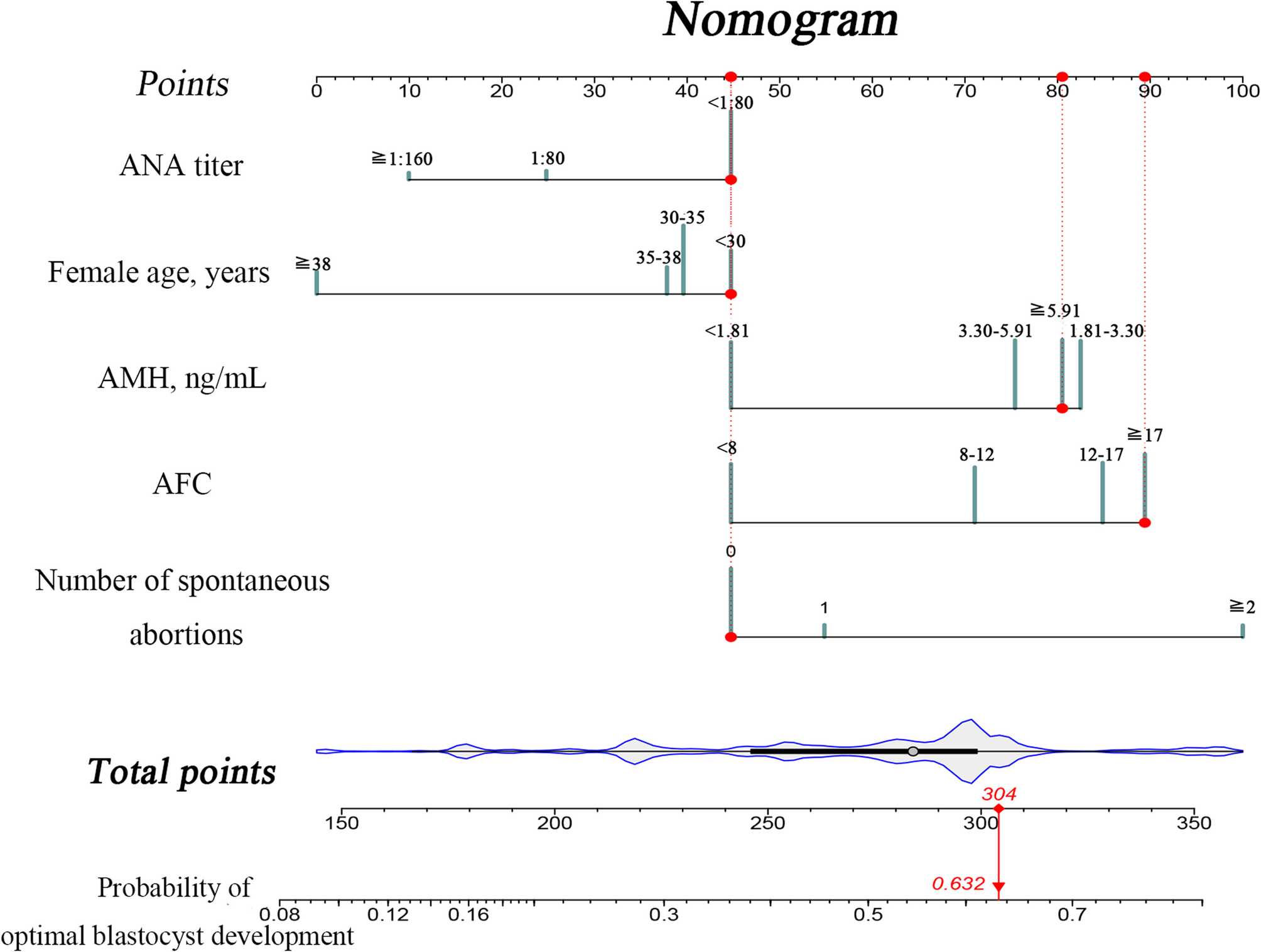 图2 用于预测最佳囊胚发育的列线图可视化