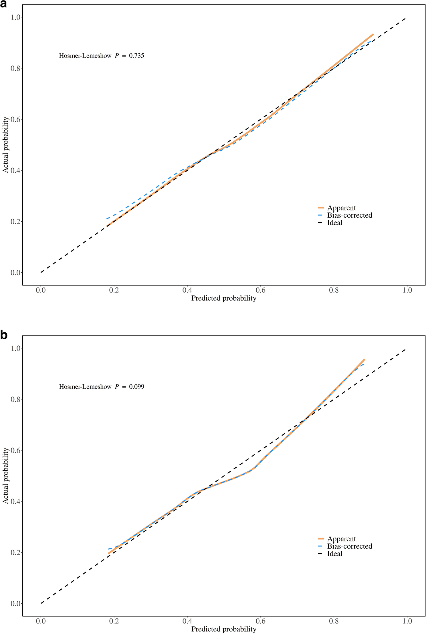 图4 用于预测训练集和验证集中最佳囊胚发育的列线图的校准曲线。a.训练集中的校准曲线。b.验证集中的校准曲线