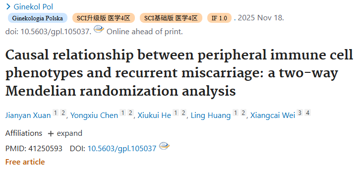 2025年11月18日,中国学者在《Ginekologia Polska》发表题为《Causal relationship between peripheral immune cell phenotypes and recurrent miscarriage: a two-way Mendelian randomization analysis》的研究。该研究利用双向孟德尔随机化(MR)方法,探讨了外周免疫细胞表型与复发性流产之间的因果关系。
