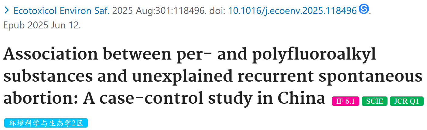 2025年8月,中国学者在《Ecotoxicology and Environmental Safety》(中科院二区,IF=6.1)发表标题为:“Association between per- and polyfluoroalkyl substances and unexplained recurrent spontaneous abortion: A case-control study in China”的研究论文。