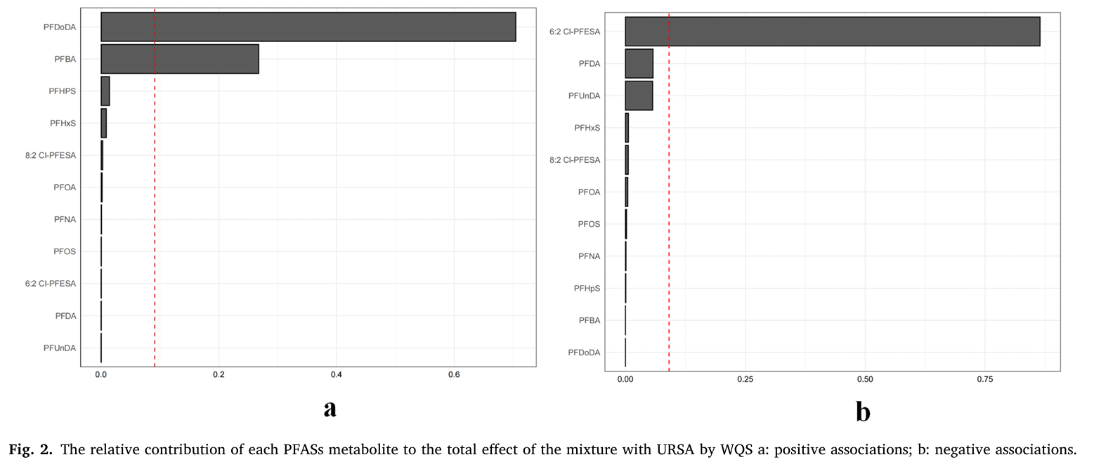 在多元WQS模型中,混合PFASs与URSA呈正相关(OR:4.87;95%CI:1.30,3.72;P<0.001)。PFASs混合效应的主要贡献因子是PFDoDA(70.45%)和PFBA(26.76%)(图2a)。当假设PFASs为负相关时,多元WQS模型也显示混合PFASs与URSA呈负相关(OR:0.36;95%CI:0.30,0.44,P<0.001),主要贡献因子是6:2Cl-PFESA(86.45%)(图2b)。