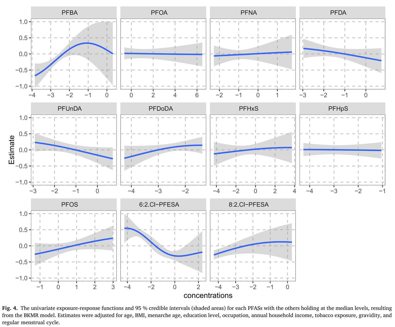 尽管先前研究已发现全氟和多氟烷基物质(PFASs)与不良妊娠结局相关,但PFASs暴露对不明原因反复自然流产(URSA)的潜在影响仍不确定。本病例对照研究旨在探讨PFASs与URSA之间的关联,研究对象为来自北京的110例URSA病例和91例对照。采用超高效液相色谱-串联质谱法(UHPLC-MS/MS)测定血清中15种PFASs的浓度,并使用多元逻辑回归分析PFASs与URSA风险之间的关联。与最低三分位数相比,PFBA(第二分位数:OR=4.26;95%CI:1.92,9.45;第三分位数:OR=8.10;95%CI:3.48,18.89)、PFDoDA(第二分位数:OR=2.17;95%CI:1.72,4.35;第三分位数:OR=3.18;95%CI:2.24,4.85)、PFHxS(第三分位数:OR=2.46;95%CI:1.15,5.25)和PFHpS(第三分位数:OR=2.56;95%CI:1.15,5.69)与较高的URSA风险呈正相关。6:2Cl-PFESA与URSA风险降低显著相关。加权分位数和(WQS)回归、分位数g计算(QGC)和贝叶斯核机器回归(BKMR)分析均确定PFBA和PFDoDA是PFASs混合物对URSA影响的主要因素。我们发现母体血清PFASs,尤其是PFBA和PFDoDA,可能会增加URSA的风险。