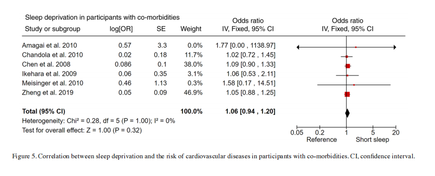 18项研究中6项涉及合并基础疾病(如糖尿病、高血脂)人群,分析显示该人群睡眠剥夺与心血管疾病风险关联无统计学意义,合并RR=1.06,95%CI:0.94-1.20,P=0.32,异质性检验I²=0%,Chi²=0.28。这提示合并基础疾病人群中,睡眠剥夺对心血管疾病风险的影响可能不显著,或受基础疾病治疗等其他因素干扰,需进一步研究。