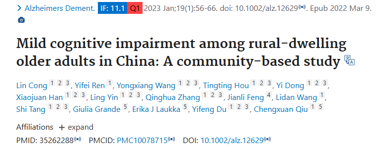 2023年1月,山东大学山东省医院神经内科团队在《Alzheimer's & Dementia》发表了一项大规模社区横断面研究。该研究纳入5068名农村老年人,结果显示MCI总患病率为26.48%,其中遗忘型MCI(aMCI)占主导(84.20%);多因素分析表明,低教育、务农、非饮酒及中风史与MCI风险显著相关,而APOE ε4基因型无显著关联。作者结论指出,农村MCI患病率高且以记忆障碍为主,防控需关注社会人口因素和血管管理。